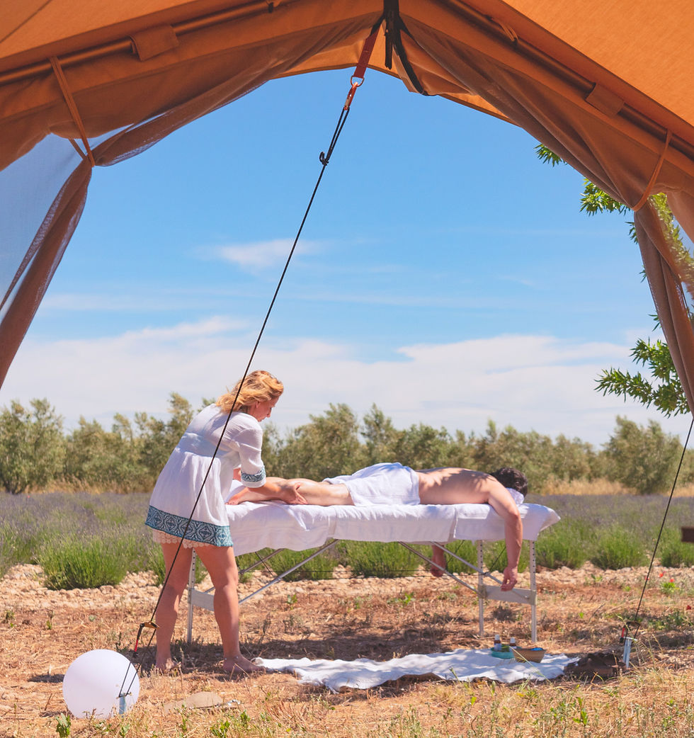 douche extérieure et wc classiques à proximité, terrasse avec fauteuils, petite table et ses 2 chaises, électricité sur batterie, climatiseur réversible pour la bulle et petit-déjeuner avec ses produits locaux inclus.